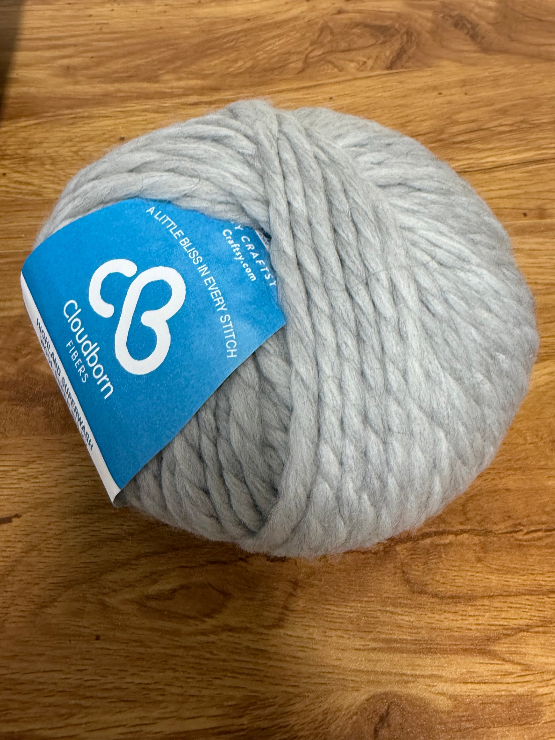1 skein of Cloudborn Fibers Highland Superwash Wool Super Bulky in light gray.