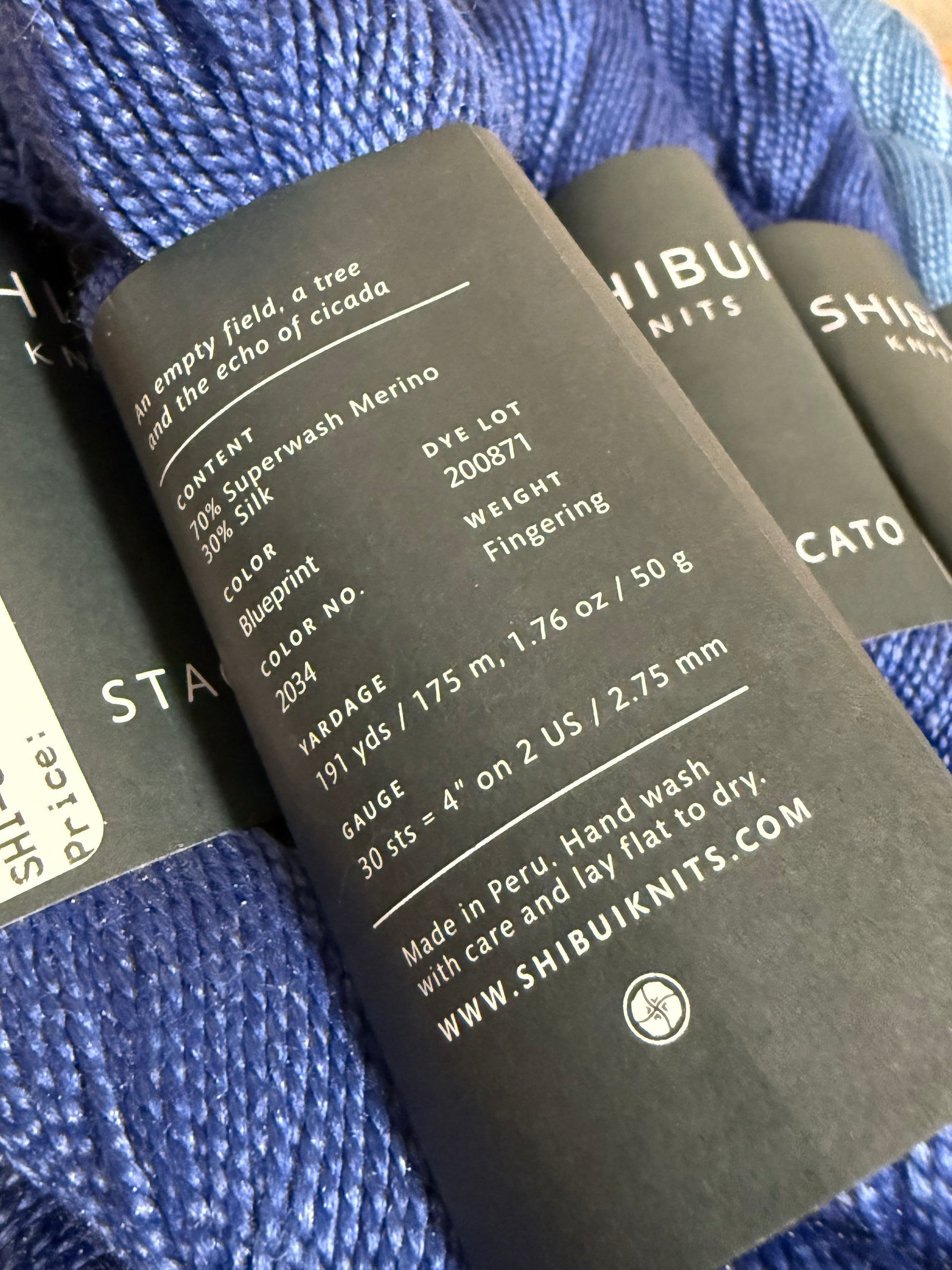 7 skeins of Shibui Knits Staccato in colorways Blueprint (5x royal blue), Shore (1x light blue), and White (1x).