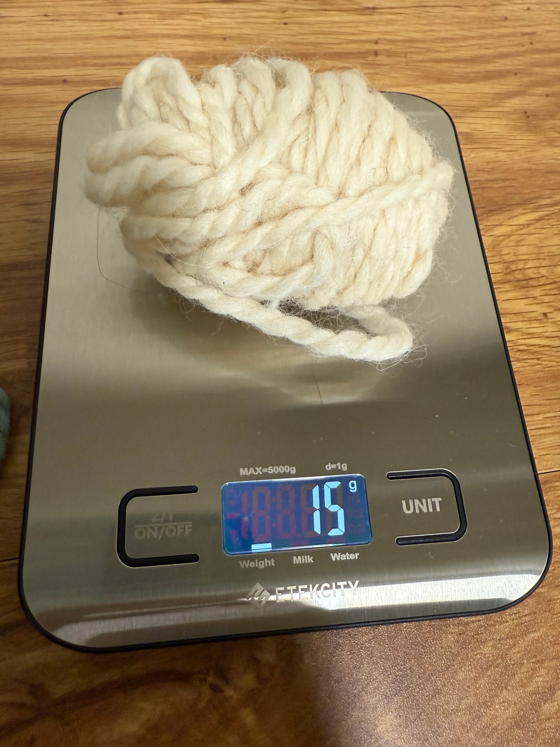 2 partial skeins of Andeamo in off-white and teal = 30g of teal and 11g of off-white = 41g.